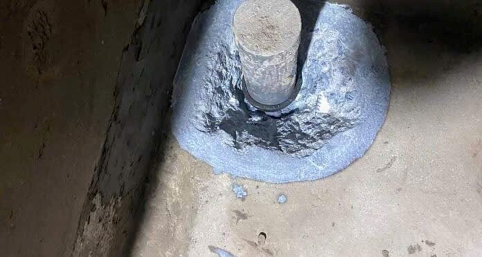 + Đục tỉa bê tông xung quanh cổ ống xuống sâu 2-3 phân, rộng 3-4 phân vát về cổ ống.