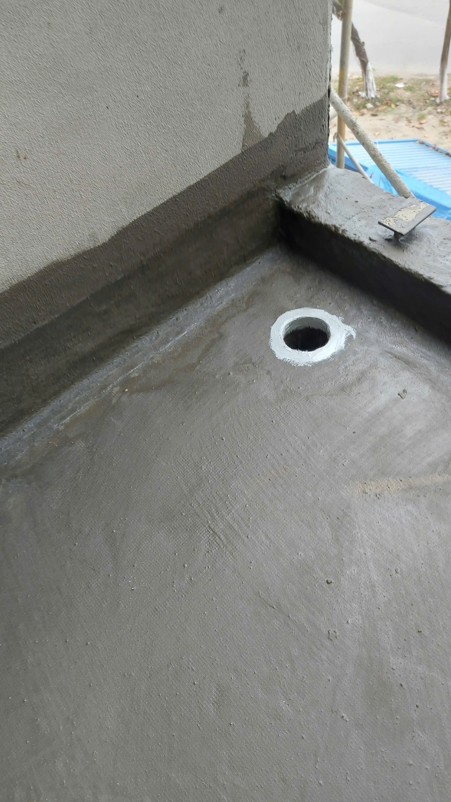 => Thi công lớp phủ thứ nhất SikaTop Seal 109 kết hợp gia cố chân tường và trải lưới sàn.